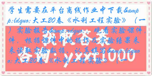 学生需要在平台离线作业中下载“大工20春《水利工程实验》(一)实验报告”,观看实验课件,根据课件中的操作及实验结果来读取实验数据、认真填写“大工20春《水利工程实验》(一